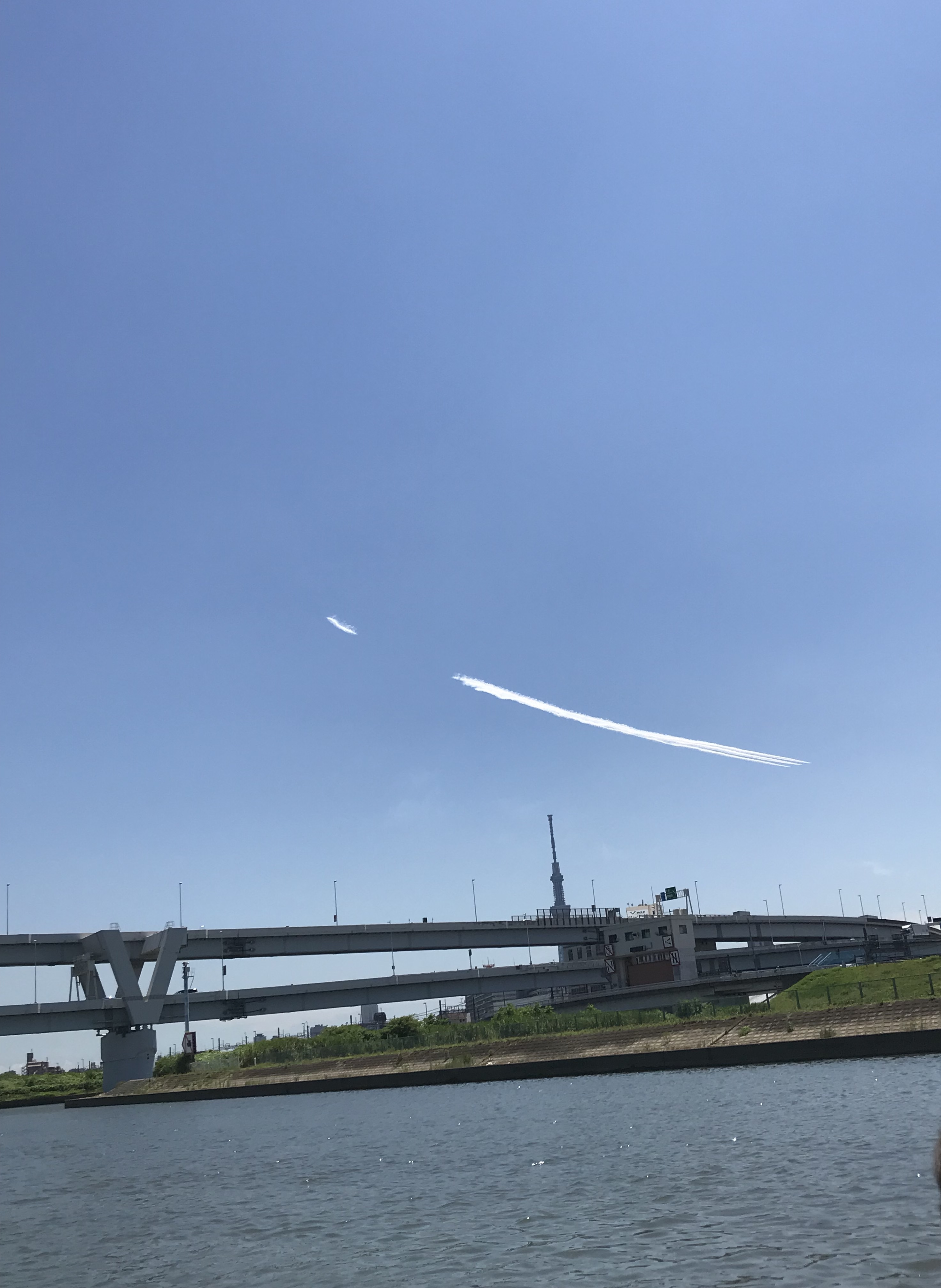 見てきました!というより、暑くて荒川に浮いていたら、たまたまブルーインパルスが飛んできて、水の中で急いでカメラを準備したら間に合わなかったという流れになります。(笑)